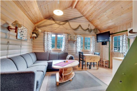 Hver hytte er på ca 35 kvadratmeter, kjøkken m/kjøleskap, komfyr, oppholdsrom, hems, tv, trådløs nettverk, dusj/wc.